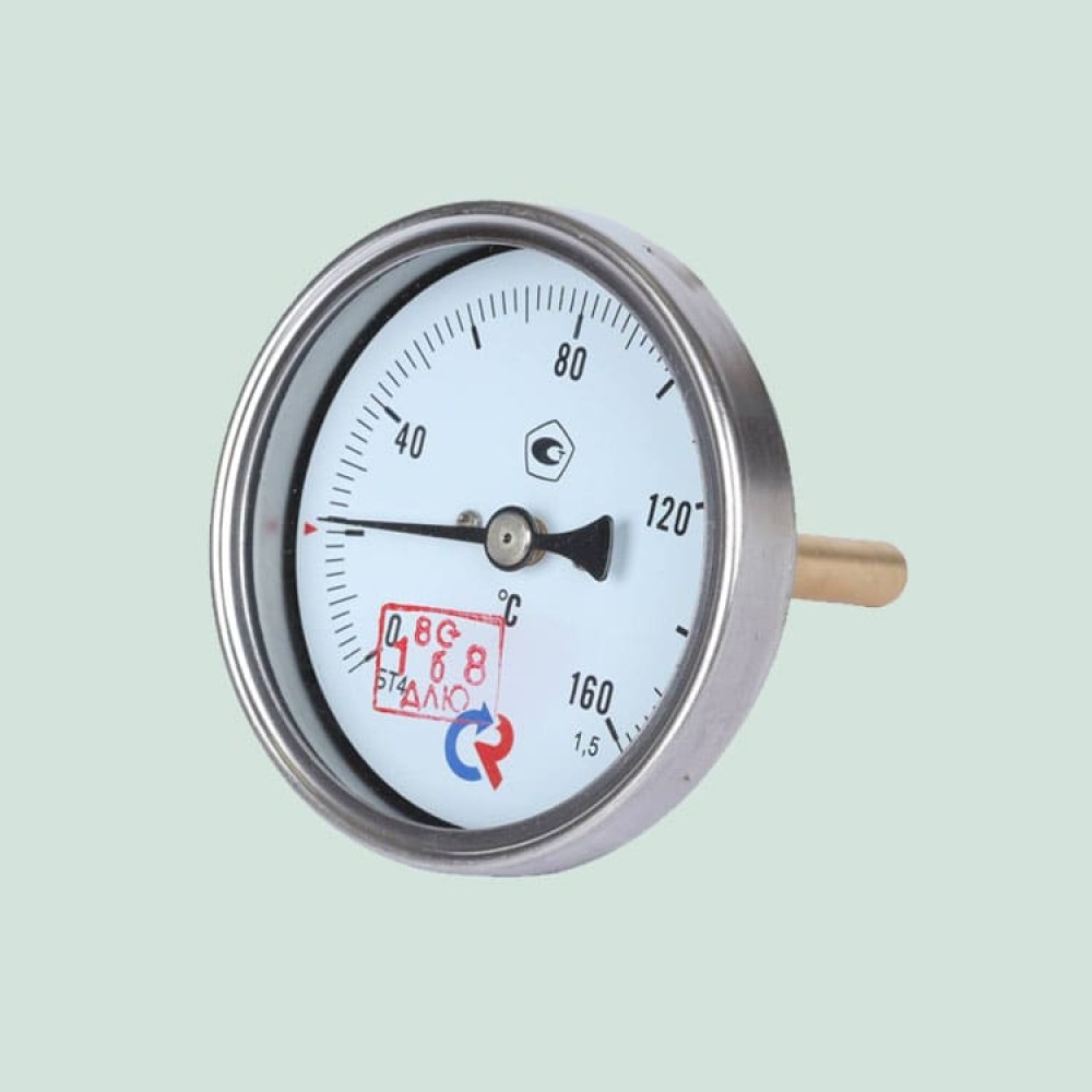 Термометр биметаллический Ду 100 160°C L=100 предназначен для измерения температуры жидкостей, пара и газов в отопительных и санитарных установках, в системах кондиционирования и вентиляции. Принцип действия прибора основан на зависимости деформации чувствительного элемента от измеряемой температуры. В качестве чувствительного элемента используется биметаллическая пружина. Она изготавливается из двух прочно соединенных металлических пластин, имеющих различные температурные коэффициенты линейного расширения. При изменении температуры пружина изгибается и вращает стрелку термометра. Один её конец закреплен внутри штока, а к другому присоединяется ось стрелки. Корпус прибора изготавливается из коррозионностойкой стали, шток — из нержавеющей стали.