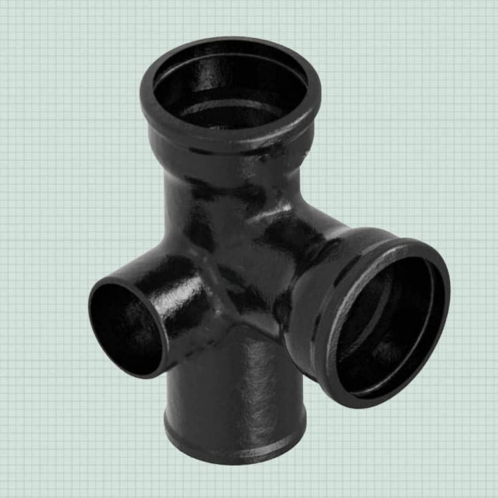 Крестовина чугунной канализации двухплоскостная 100х100х50х90° (левая) предназначена для подключения к трубопроводу дополнительных ответвлений в двух плоскостях.